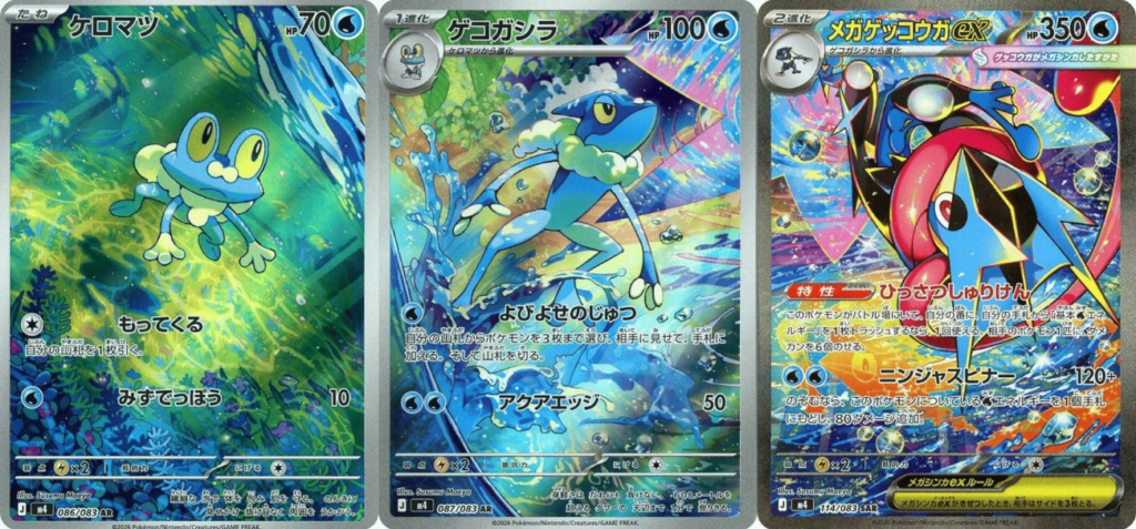 また、ニンジャスピナーに収録されている『ケロマツ AR』『ゲコガシラ AR』とメガゲッコウガex SARを進化順に並べると、1枚の繋がったイラストとして完成する仕様になっています。コレクターにとっては3枚セットで集めたくなる、ファン心をくすぐる演出です。